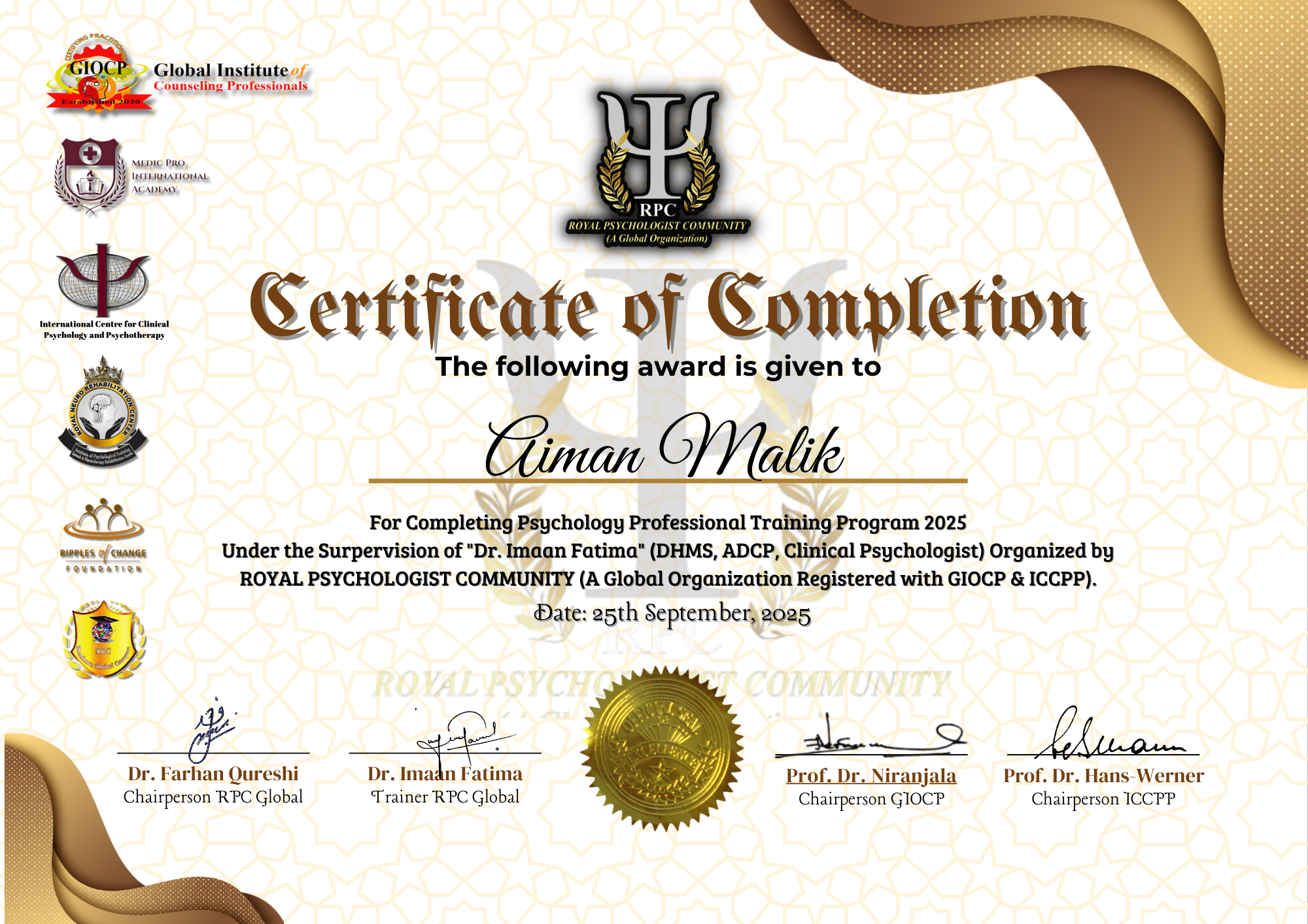 Aiman Malik has achieved outstanding milestones by earning numerous certificates from RPC Global. Each certificate reflects her dedication, hard work, and passion for learning. These accomplishments not only showcase her exceptional abilities but also highlight their commitment to continuous growth and excellence in various fields of psychology.