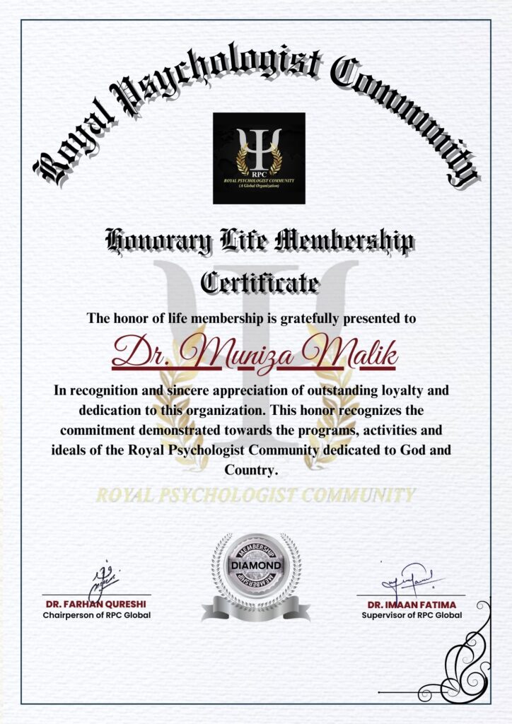 Dr. Muniza Malik has achieved outstanding milestones by earning numerous certificates from RPC Global. Each certificate reflects her dedication, hard work, and passion for learning. These accomplishments not only showcase her exceptional abilities but also highlight their commitment to continuous growth and excellence in various fields of psychology.