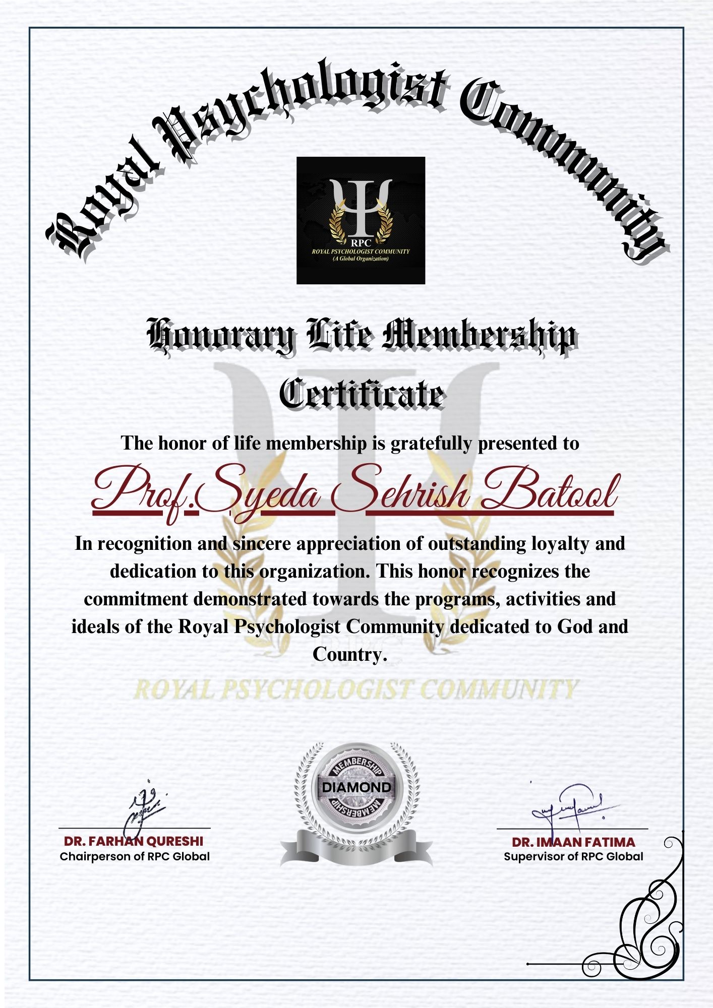Prof.Syeda Sehrish Batool has achieved outstanding milestones by earning numerous certificates from RPC Global. Each certificate reflects her dedication, hard work, and passion for learning. These accomplishments not only showcase her exceptional abilities but also highlight their commitment to continuous growth and excellence in various fields of psychology.