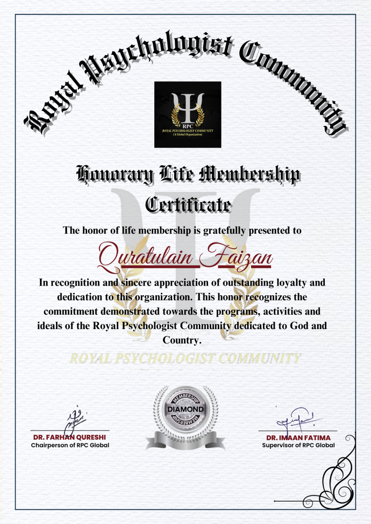 Quratulain Faizan has achieved outstanding milestones by earning numerous certificates from RPC Global. Each certificate reflects her dedication, hard work, and passion for learning. These accomplishments not only showcase her exceptional abilities but also highlight their commitment to continuous growth and excellence in various fields of psychology.