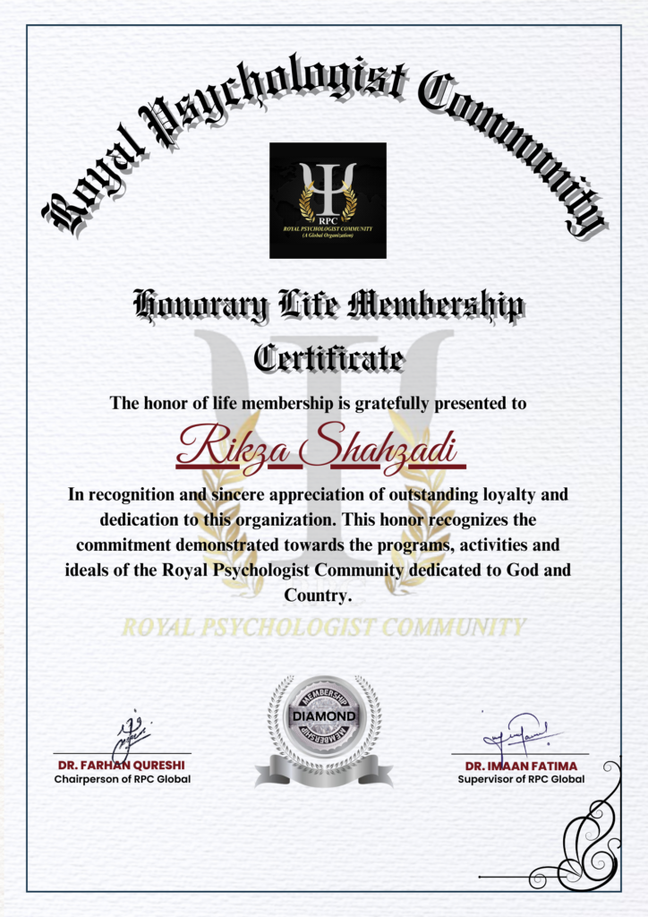 Rikza Shahzadi has achieved outstanding milestones by earning numerous certificates from RPC Global. Each certificate reflects her dedication, hard work, and passion for learning. These accomplishments not only showcase her exceptional abilities but also highlight their commitment to continuous growth and excellence in various fields of psychology.