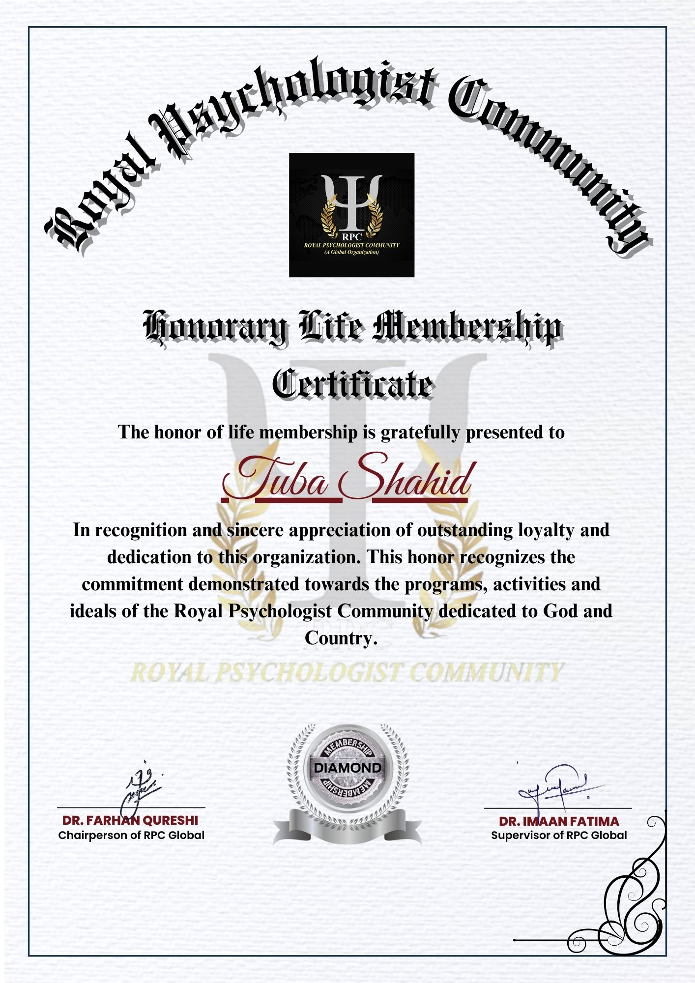 Tuba Shahid has achieved outstanding milestones by earning numerous certificates from RPC Global. Each certificate reflects her dedication, hard work, and passion for learning. These accomplishments not only showcase her exceptional abilities but also highlight their commitment to continuous growth and excellence in various fields of psychology.